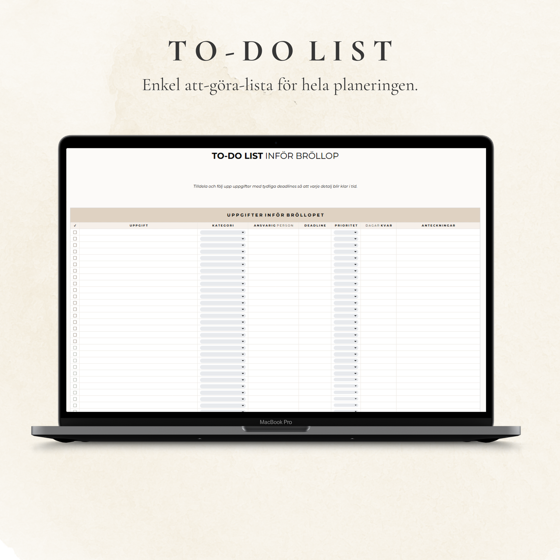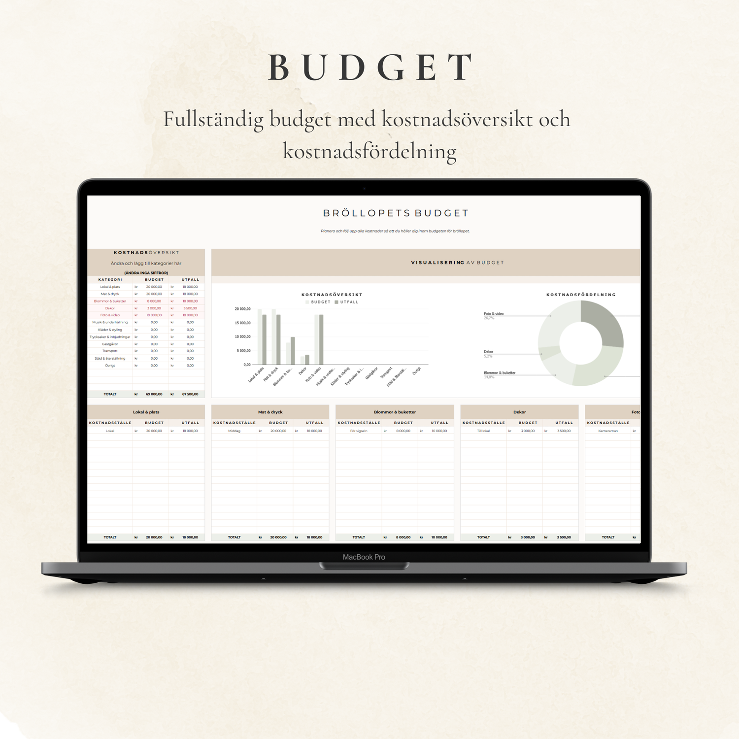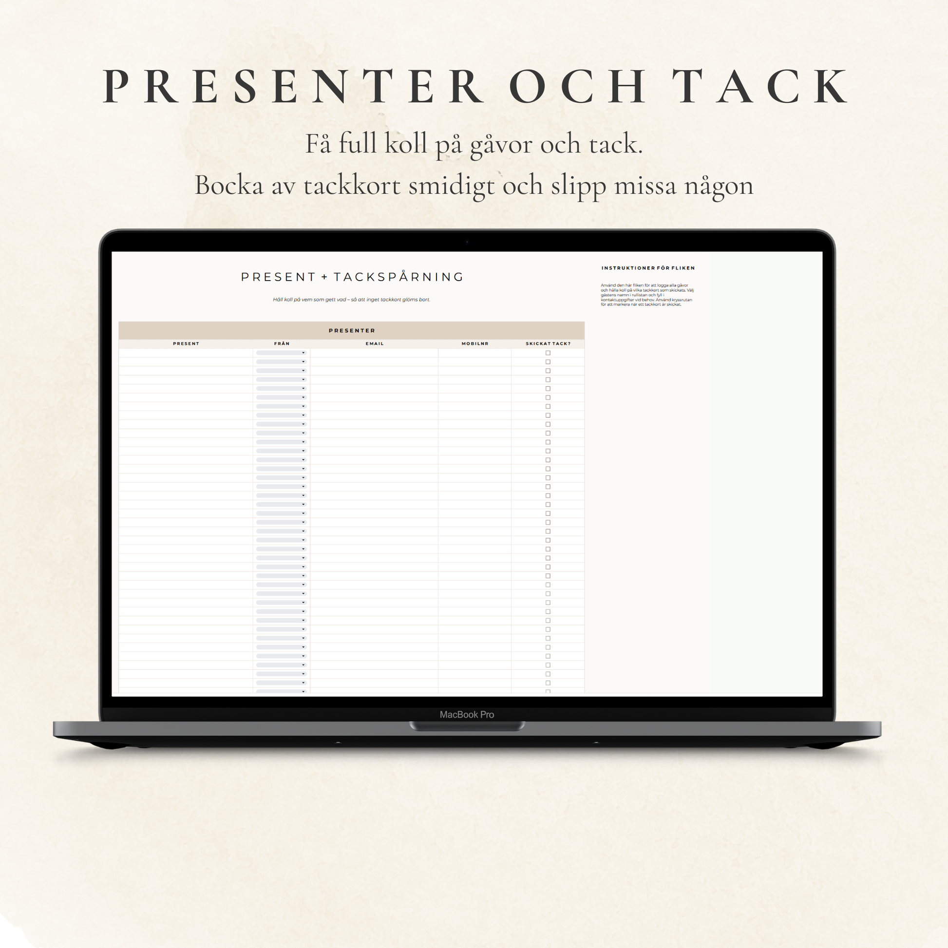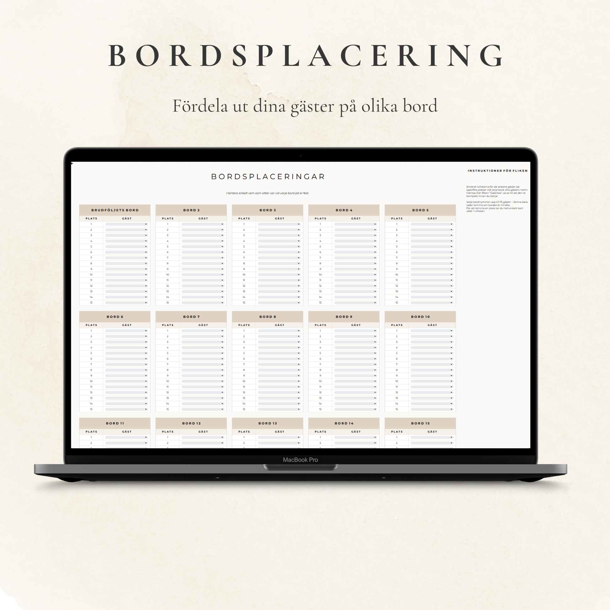 Ni får en komplett mall med allt på ett ställe – budget, gästlista, menyer, sittplatser, allergier, leverantörer och mycket mer. Allt är redan uppbyggt åt er med tydliga kategorier och smarta översikter som gör det lätt att hålla koll, även när detaljerna blir många.
